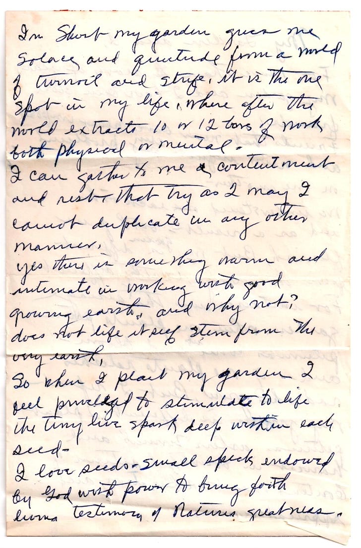 “In short, my garden gives me solace and quietude from a world of turmoil and strife. It is the one spot in my life, where after the world extracts 10 or 12 hours of work, both physical and mental. I can gather to me a contentment and respite that try as I may I cannot duplicate in any other manner. Yes, there is something warm and intimate in working with good growing earth, and why not? Does not life itself stem from the very earth? So when I plant my garden I feel privileged to stimulate to life the tiny live spark deep within each seed. I love seeds. Small specks endowed by God with power to bring forth living testimony of natures greatness.”