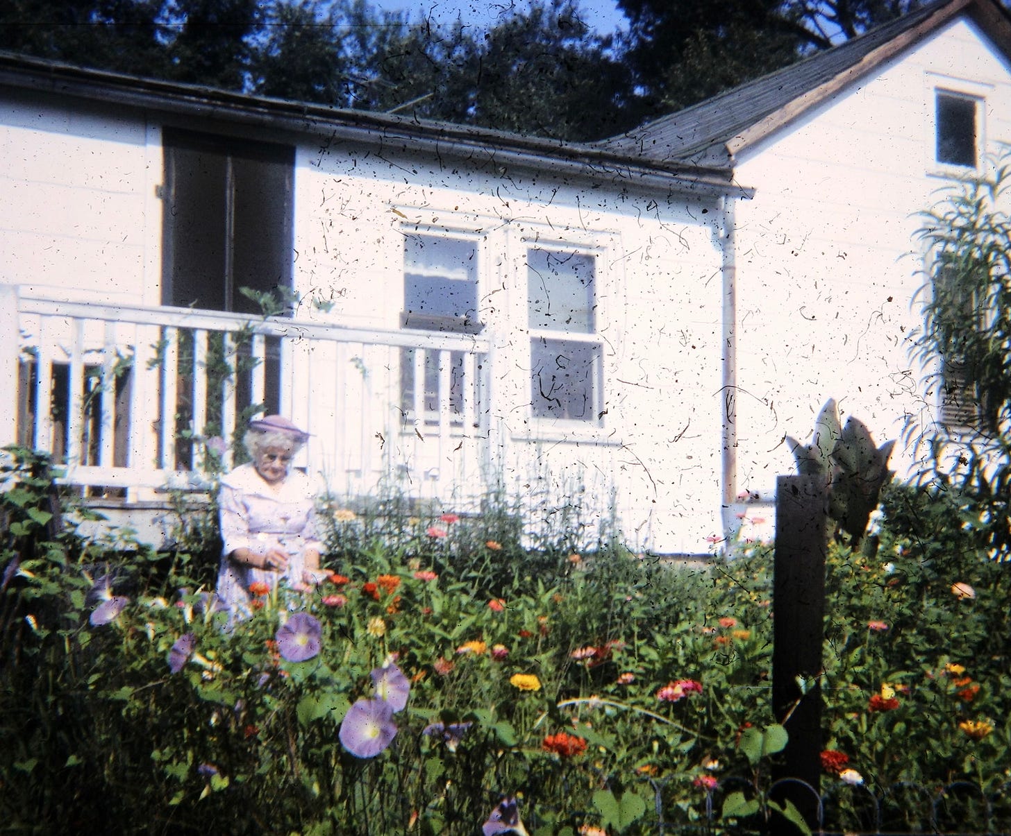 Fiesty little Mae was a master gardener for sure. Out of necessity and out of love. And, even though the house is gone, her plantings are still coming up all over the property… and I’ve been able to save much of it. Iris, Tiger Lily, Daffodils, Wild Rose…. almost in homage to her, they push up for another season. Here’s Mae in her flower garden, right off her room in their house. She spent a lot of time out here.